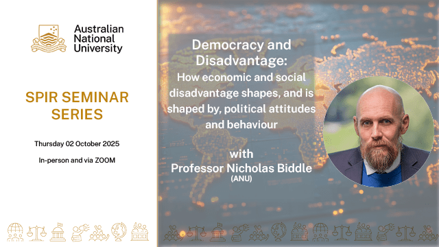 It is close to a truism to say that democratic institutions and norms are under threat across established, high-income democracies. This is most obvious in the US, with an uptick in political violence, contested elections, and state-directed restrictions on free speech and expression (to name but a few of the challenges). However, all rich democracies face a combination of country-specific and common pressures. Public attitudes, and in particular support for and confidence in democratic institutions, are both an indicator of and potential causal factor explaining democratic decline and pressure. Demographic factors – including age/generation, gender, race/ethnicity, and education – have been used to explain these trends, both in Australia and abroad. However, sitting across many of the explanations for attitudinal trends is the profound way in which perceived economic and social disadvantage shape, and are shaped by, political attitudes and behaviour. The aim of this seminar is to explore what the latest data can tell us about these complex relationships in the present moment. The seminar will be structured in six parts: 1) Introducing the framework of democratic resilience and its relationship to economic and social disadvantage 2) Documenting the most salient trends in disadvantage 3) A short interlude considering the evidence on the role of institutional design in shaping economic and social outcomes 4) A detailed description of who considers themselves disadvantaged and how that relates to other objective indicators 5) The empirical link between these measures of disadvantage and political attitudes and behaviour and 6) A short reflection on the implications.